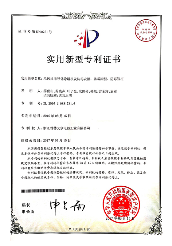 2017年單風(fēng)機(jī)半導(dǎo)體除濕機(jī)及防霉衣柜、防霉櫥柜、防霉鞋柜實(shí)用新型專利證書