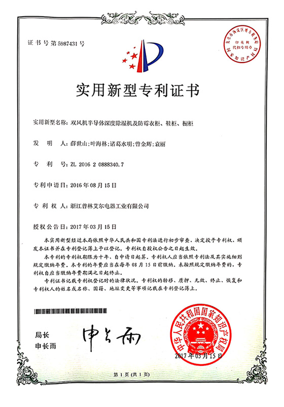 2017年雙風(fēng)機(jī)半導(dǎo)體深度除濕機(jī)及防霉衣柜、鞋柜、櫥柜實(shí)用新型專利證書