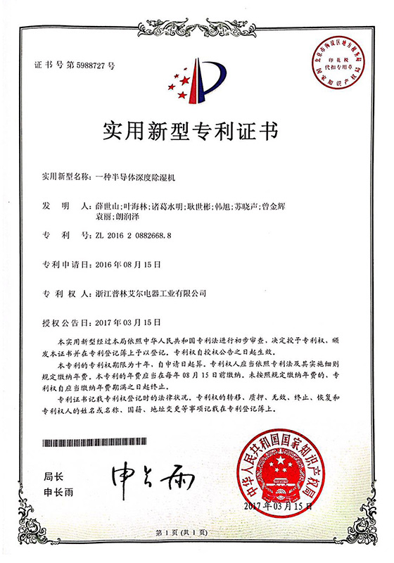 2017年一種半導(dǎo)體深度除濕機(jī)實(shí)用新型專利證書