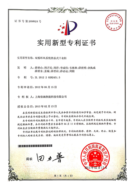 2013年雙循環(huán)風(fēng)系統(tǒng)熱泵式干衣柜實(shí)用新型專利證書