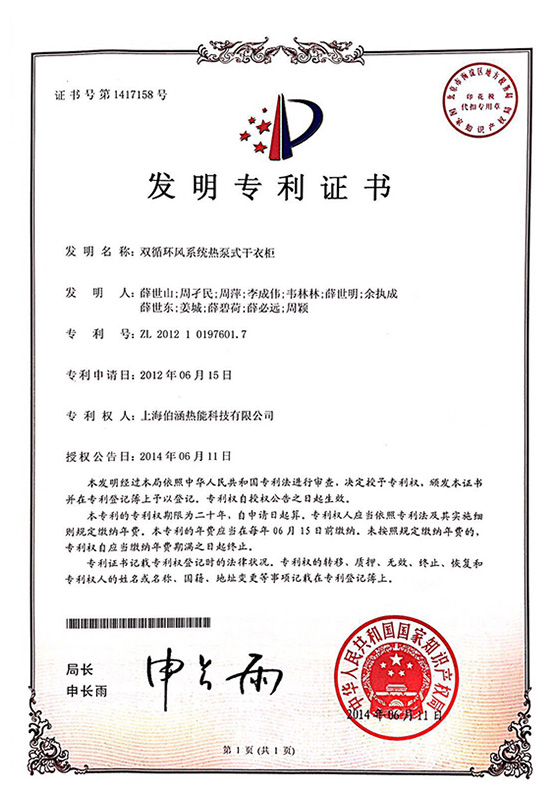2014年雙循環(huán)風(fēng)系統(tǒng)熱泵式干衣柜發(fā)明專利證書