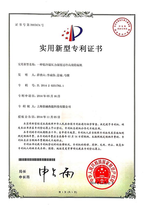 2014年一種低冷凝壓力深度過冷高效除濕機(jī)實(shí)用新型專利證書