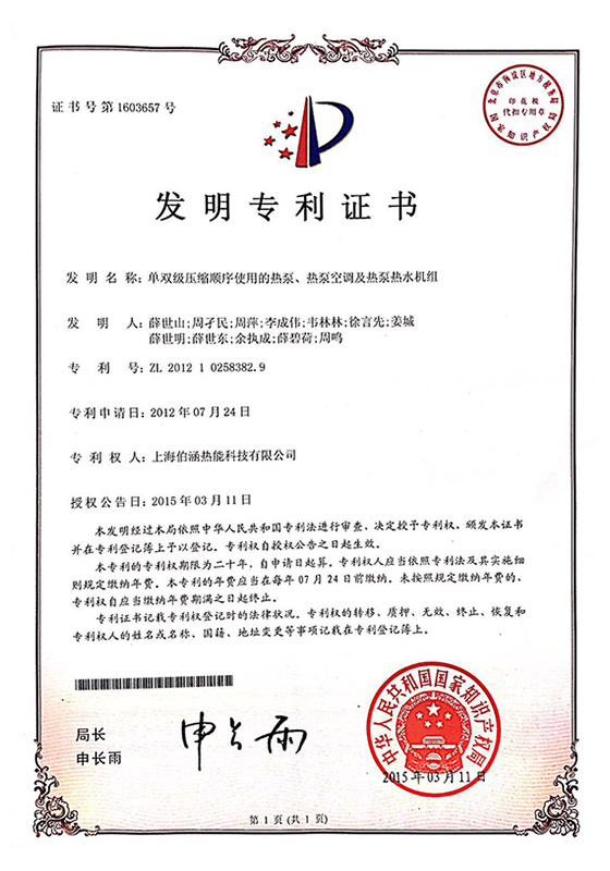 2015年單雙級壓縮順序使用的熱泵、熱泵空調(diào)及熱泵熱水機(jī)組發(fā)明專利證書