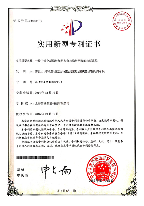 2015年一種干燥介質(zhì)梯級加熱與余熱梯級回收的熱泵系統(tǒng)實(shí)用新型專利證書