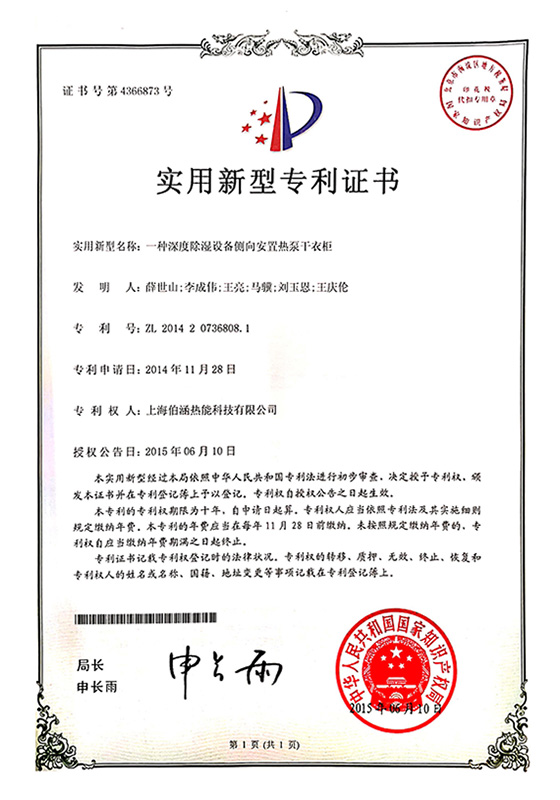 2015年一種深度除濕設(shè)備側(cè)向安置熱泵干衣柜實(shí)用新型專利證書