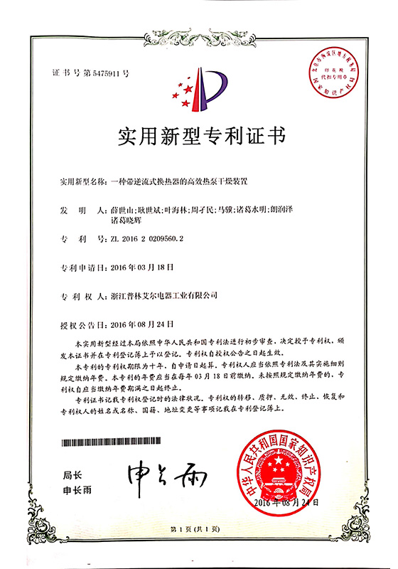 2016年一種帶逆流式換熱器的高效熱泵干燥裝置實(shí)用新型專利證書