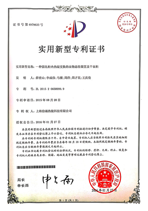 2016年一種強(qiáng)化柜內(nèi)熱濕交換的衣物懸掛裝置及干衣柜實(shí)用新型專利證書
