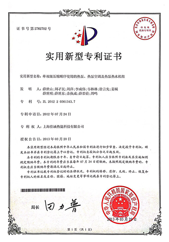 2013年單雙級(jí)壓縮順序使用的熱泵、熱泵空調(diào)及熱泵熱水機(jī)組實(shí)用新型專(zhuān)利證書(shū)