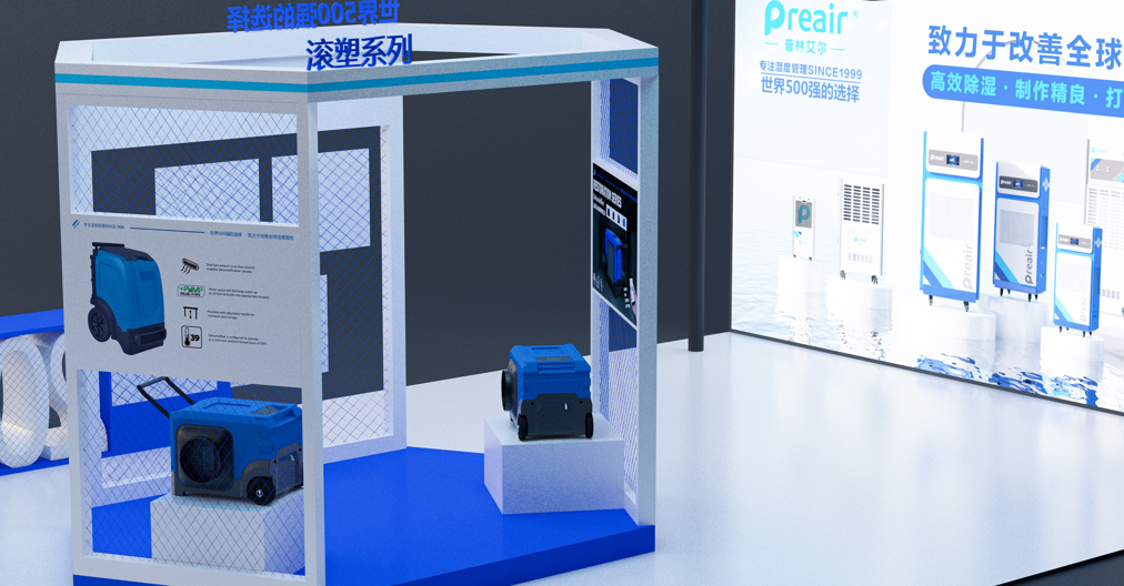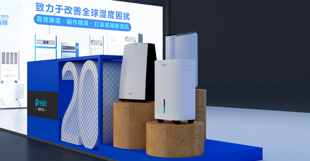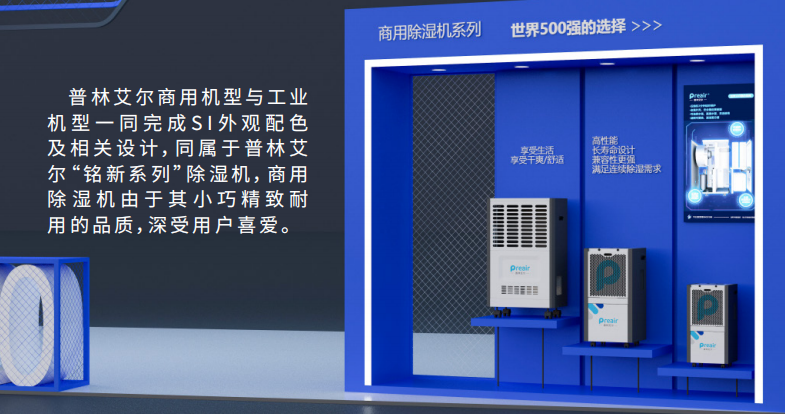 對于占比最大的兩塊燈箱海報,將本次參展的全系列機型( 不包含外貿(mào)機型)靜態(tài)集中展示,配合品牌的主打廣告語和使命愿景,讓來展臺的觀眾,一下就能關(guān)注到我司的使命:普林艾爾——致力于改善全球濕度困擾。